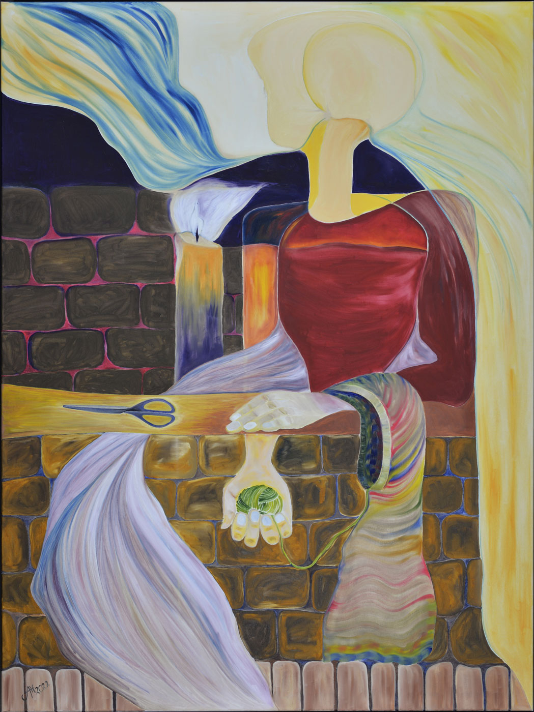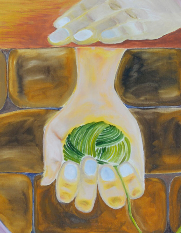 Wie als Ergänzung der Szenerie scheint der Sterbende ein Knäuel zu halten, oder auch weiterzureichen, über die Mauer nach vorne zu reichen, als würde der Lebensfaden weitergegeben werden wollen, der Sterbende längst verstanden hat, dass er seine letzten Schritte tut. Auch das entsprechende Kleidungsstück, von dem der Faden stammt, wurde bereits ausgezogen und über die Mauer gelegt, wie um es dort abzulegen und zurückzulassen.